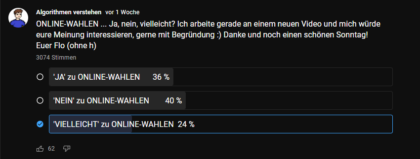 Dank einer aktuellen Umfrage des YouTubers „Algorithmen verstehen“ zu dem Thema „Online-Wahlen – Ja, Nein, Vielleicht“ wurde seine IT-Affine Community gefragt, ob sie Online wählen gehen würden. Die Ergebnisse haben mich selbst etwas überrascht: